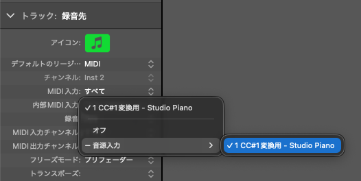 6. 録音先トラックの内部MIDI入力で[音源入力] > [CC#1変換用]を選択