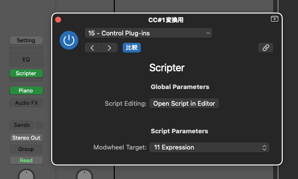 MIDIキーボードからCC#1をダミートラック(CC#1変換用)に入力。 Logic Proの付属プラグイン『Scripter』でCC#11に変換。 本命トラック(録音先)の内部MIDI入力をダミートラックに設定して録音。 ざっくりこんな流れ ────